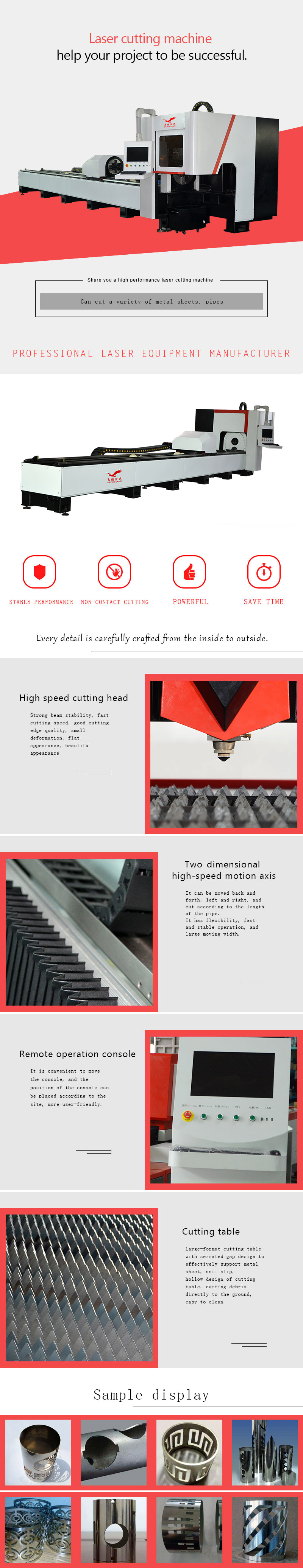 T6020 laser pipe cutting machine can cut rectangular pipe, square pipe, elliptical pipe, round pipe and special-shaped pipe at high speed, and profiles such as angle steel and channel steel.